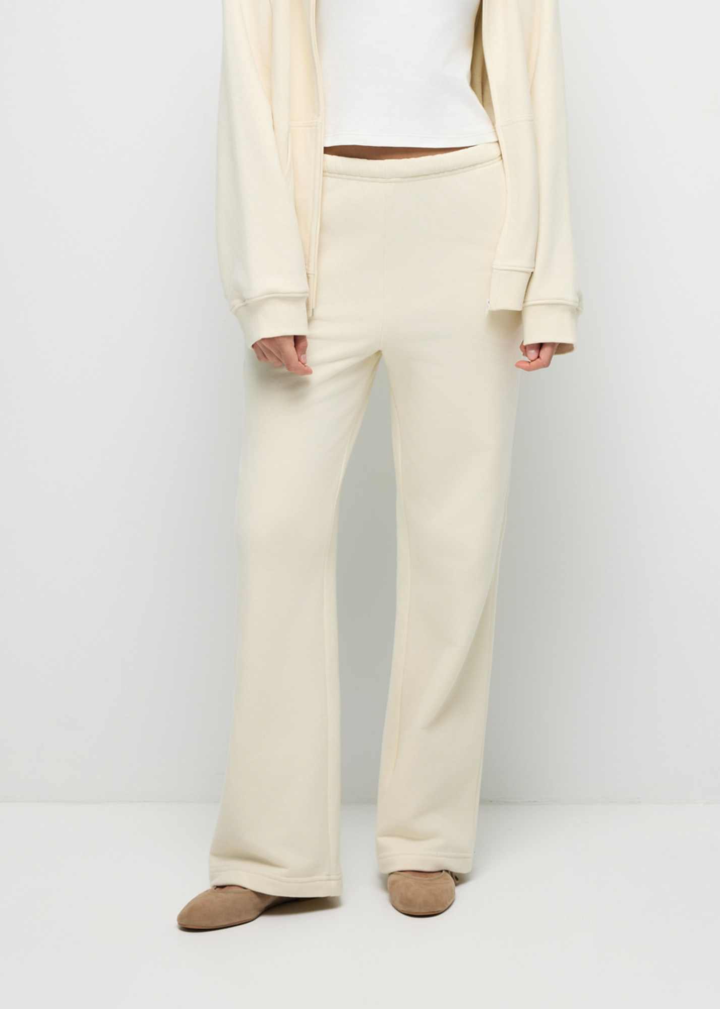 Spodnie dresowe Vanila to proste, dresowe spodnie uszyte z tej samej miękkiej dzianiny co bluza Vanila. Materiał ma lekki meszek, dzięki czemu spodnie są przyjemne w dotyku jak chmurka. Mają luźniejszy, swobodny krój i sznurek w talii, który pozwala dopasować je idealnie do sylwetki. Wyglądają czysto i minimalistycznie, a jednocześnie są wyjątkowo komfortowe - idealne do codziennych stylizacji, na podróż, spacer czy leniwy dzień w domu.