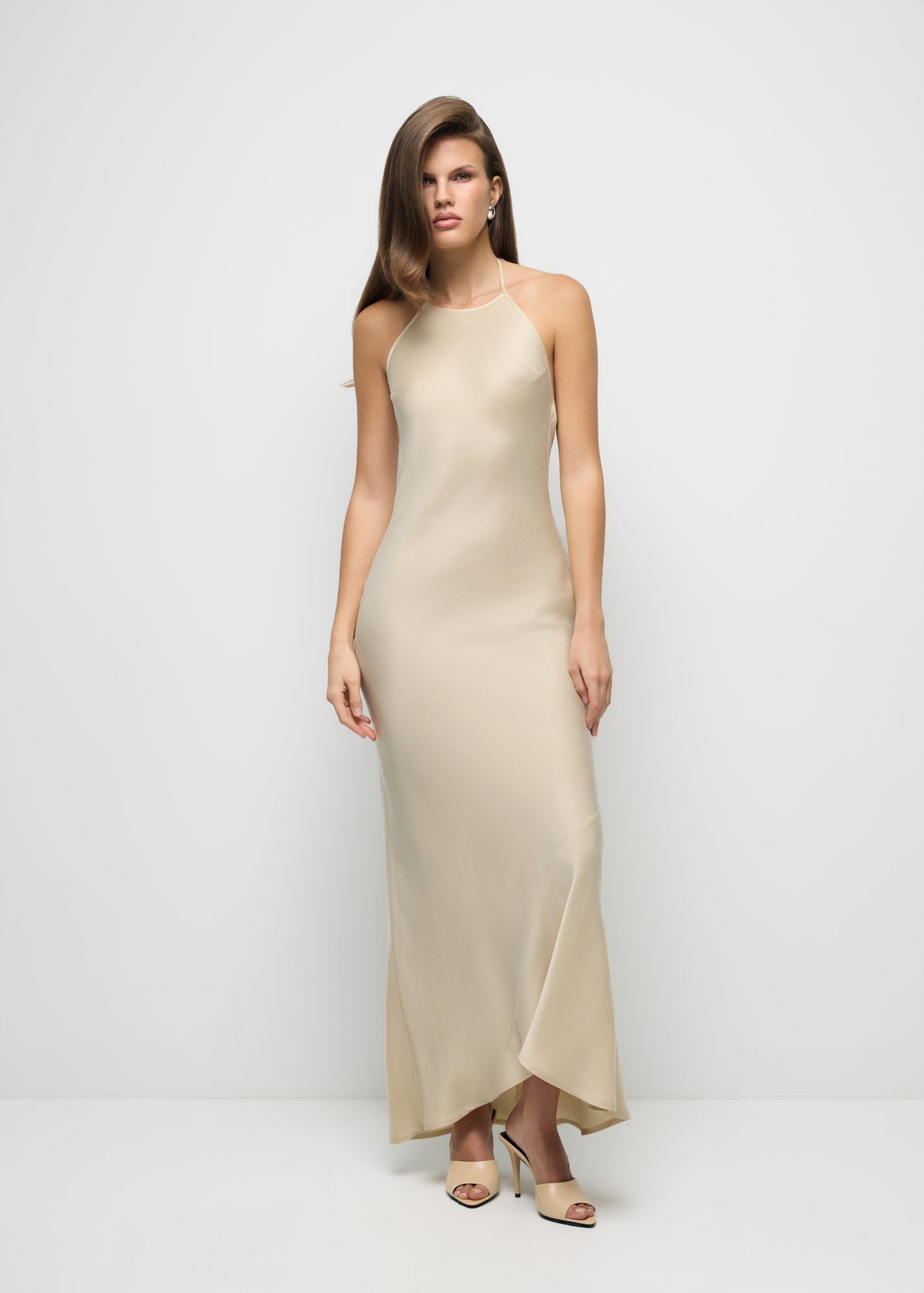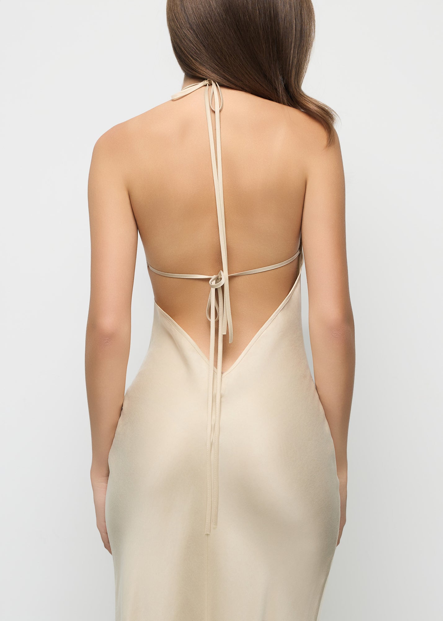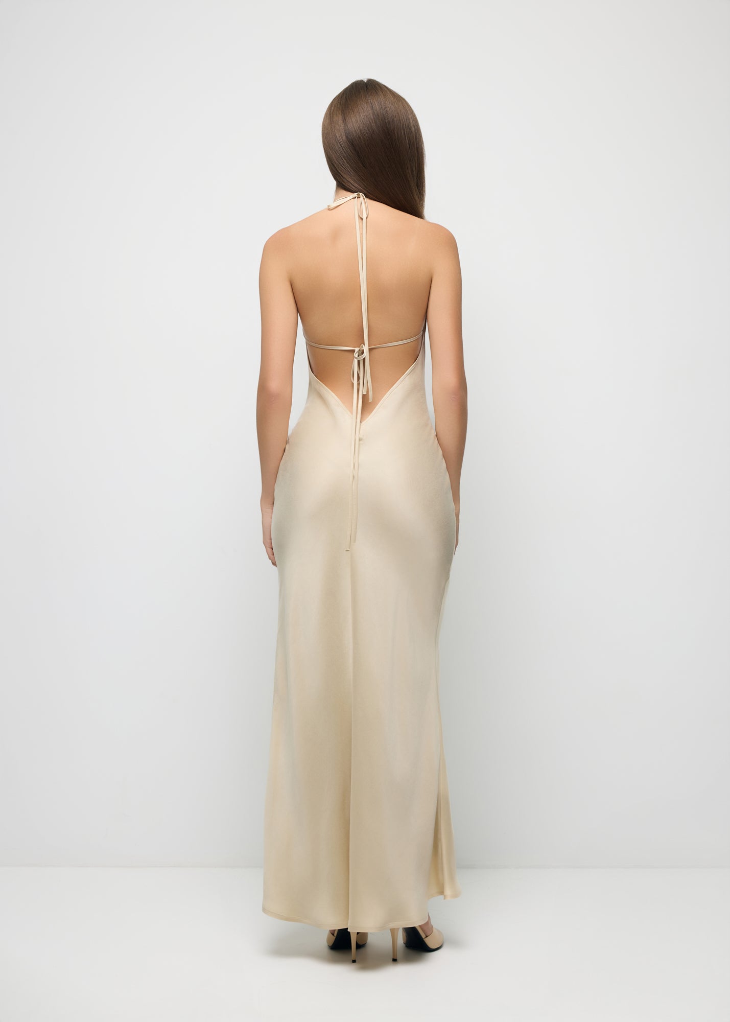 Nina is a long, halter-neck dress with an open V-shaped back. Made from Italian cupro in a champagne shade - a fabric derived from natural fibers, known for its beautiful silky sheen and exceptional durability.